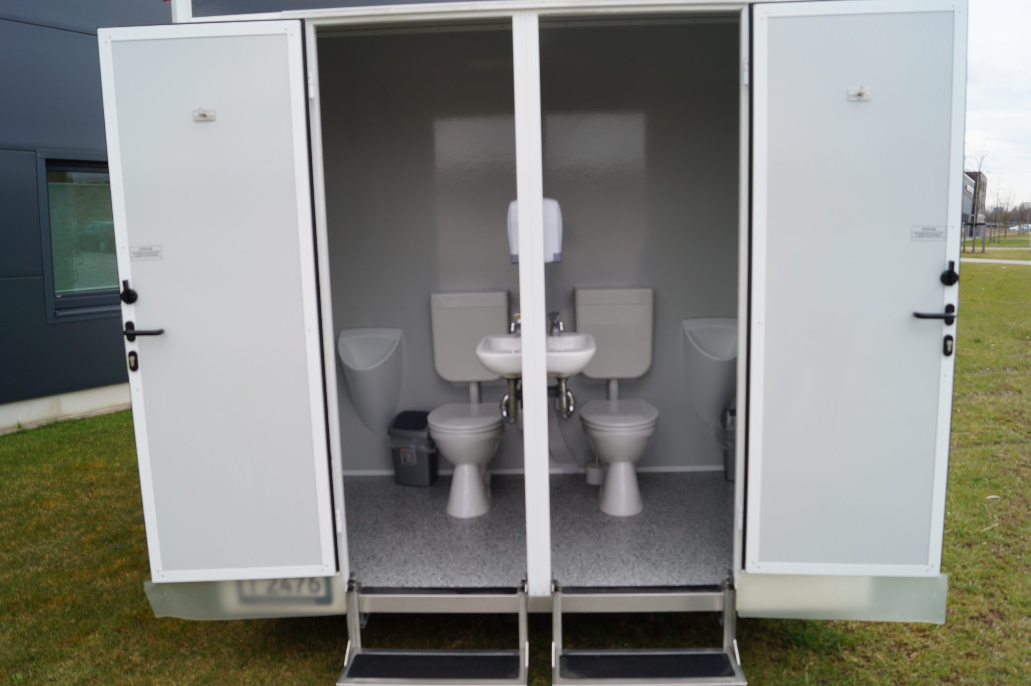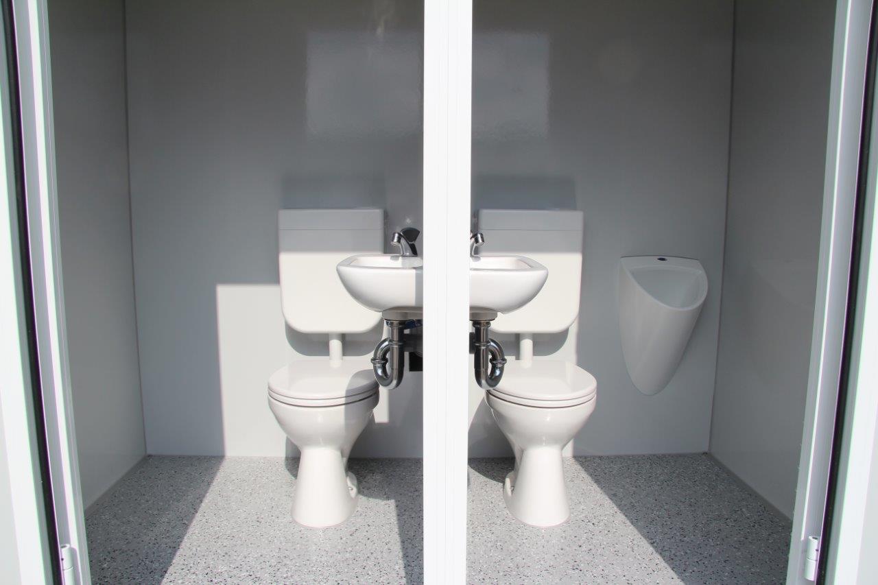 – Zwei weitere Toilettenkabinen (von außen begehbar) mit jeweils: 1x WC, 1x Urinal, 1x Waschbecken, Seifenspender , Papierspender, Heizung, LED-Beleuchtung und Spiegel