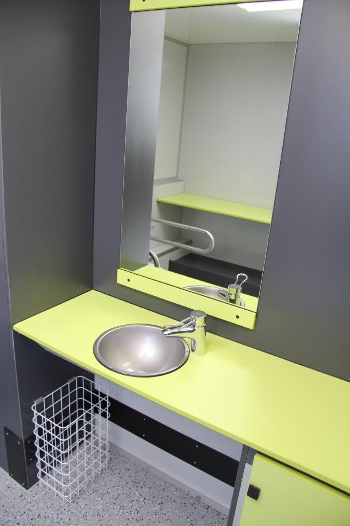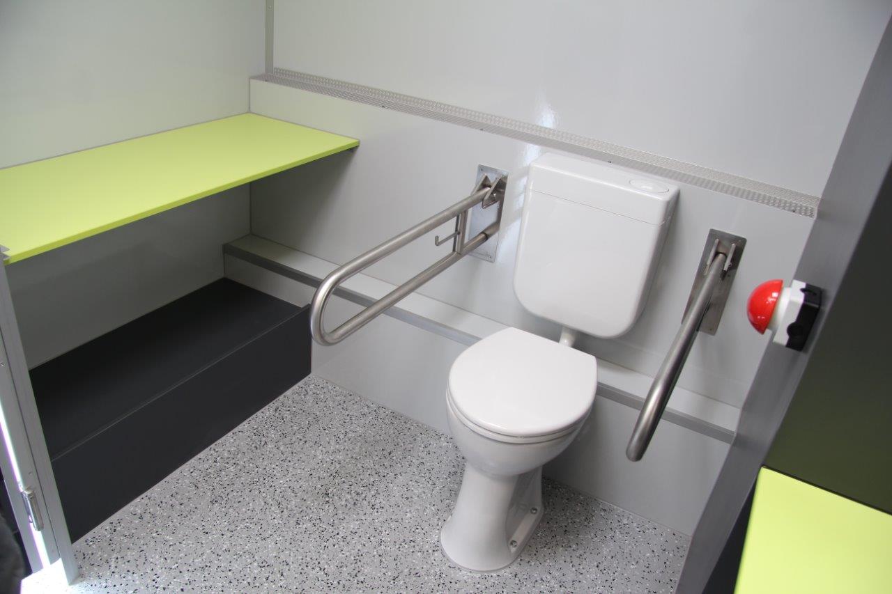 – Handicap-Kabine: 1 Toilette, 1 Waschbecken, Seifenspender, Papierspender, Heizung, LED-Beleuchtung, Spiegel und Notsignal
