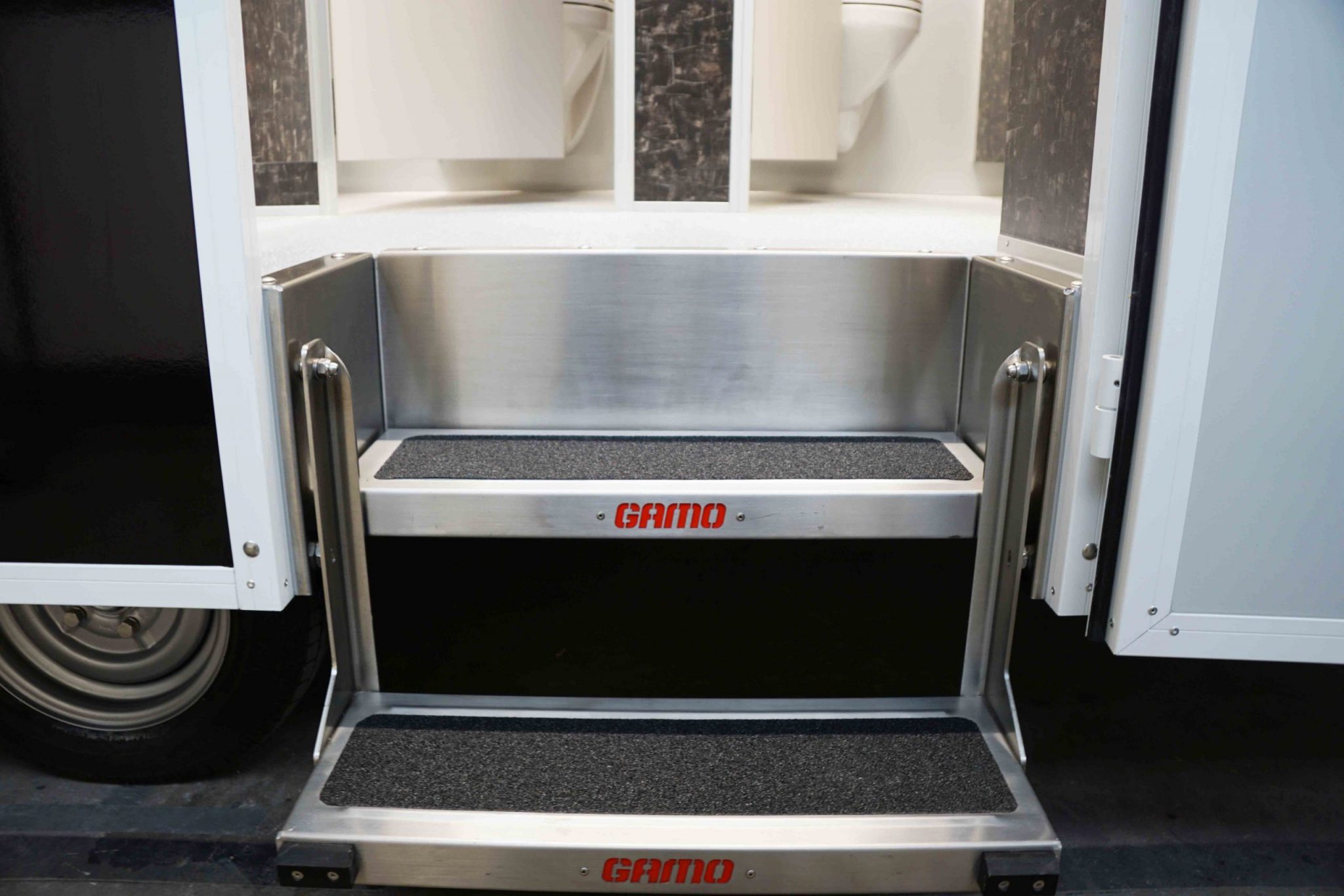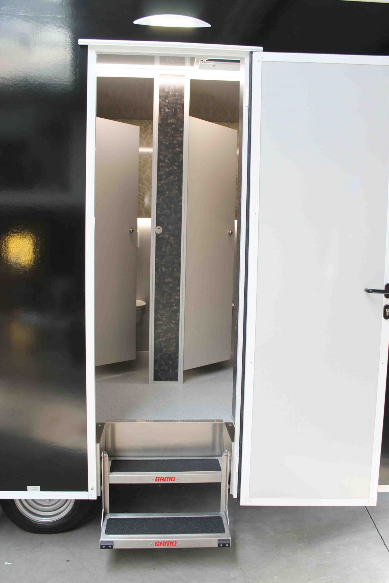 – Die am Fahrgestell angebrachten Spindelstützen werden am Aufstellort einfach herabgelassen und das komplette Fahrzeug steht stabil und sicher. Zum Begehen des Toilettenanhängers werden zwei Sicherheitseinstiegstritte herausgeschwenkt.