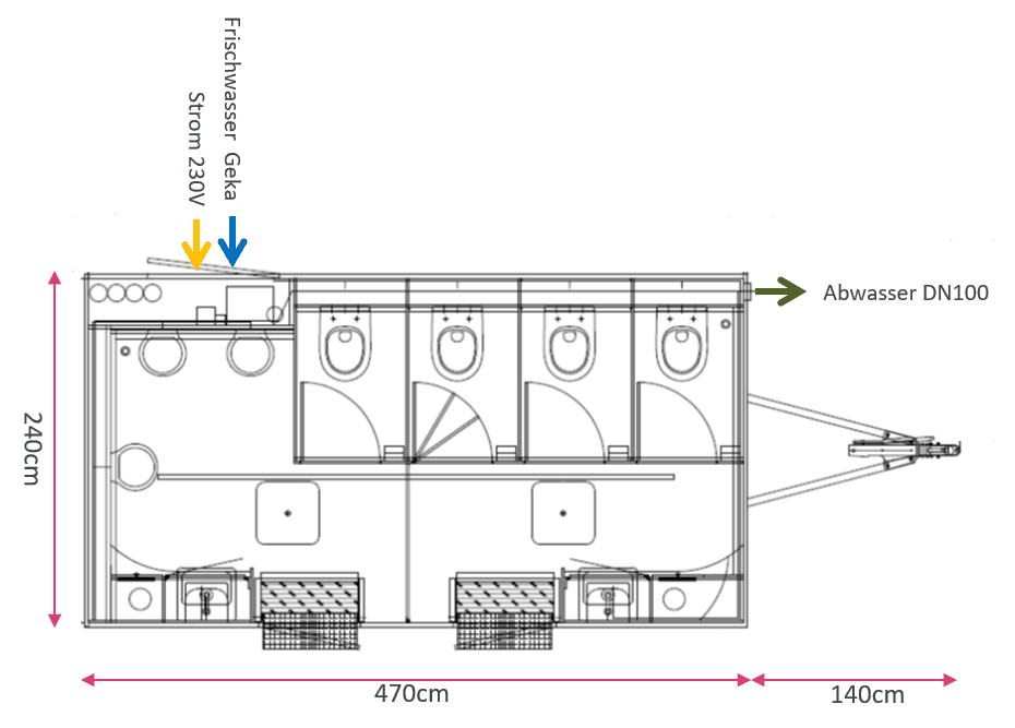 – DN100 Abwasseranschluss (alternativ auch mit Abwasserpumpe erhältlich)